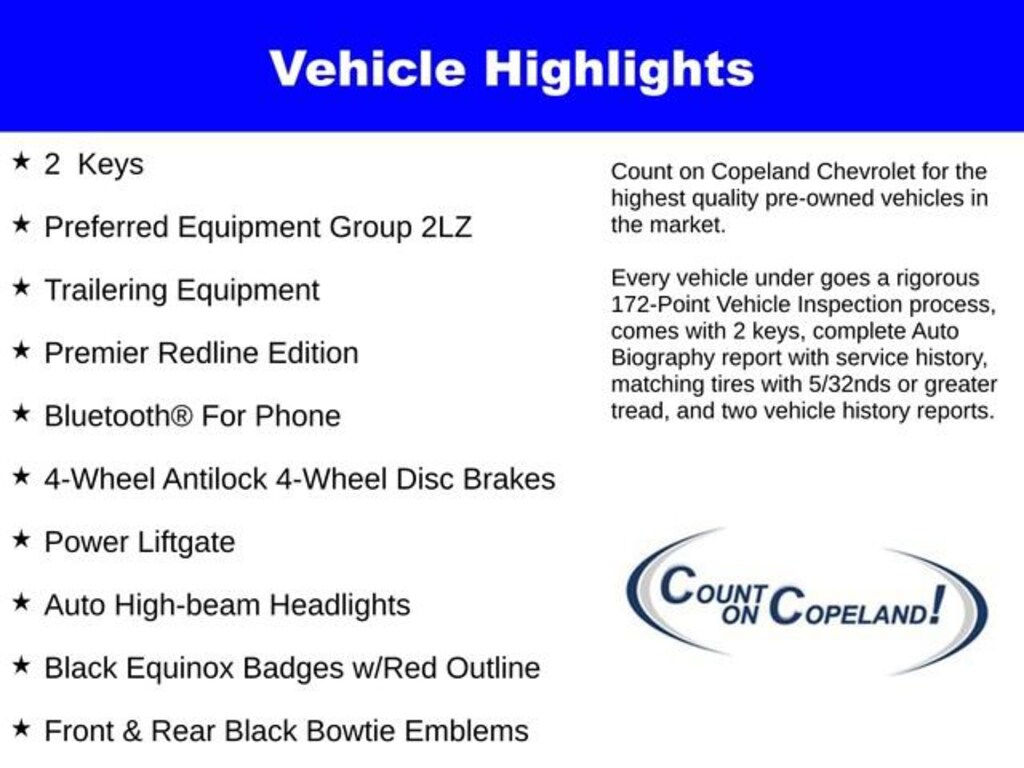 Count on Copeland Chevrolet in Brockton, MA for top-quality used vehicles!This 2020 Chevrolet Equinox Premier is a standout choice, boasting an impressive array of premium features. Highlighted by its custom-molded rear splash guards, Redline-specific black grille, and bold black Equinox badges with a red outline, this Equinox exudes a striking, confident presence. The Premier Redline Edition package further elevates the experience, with 19-inch black wheels with red accents, black center caps, and Mosaic Black mirror caps. 2 Keys PREMIER REDLINE EDITION Trailering EquipmentUnder the hood, this Equinox is equipped with a powerful 2.0L turbocharged engine mated to a smooth-shifting 9-speed automatic transmission with all-wheel drive, delivering an impressive balance of performance and efficiency with 22 city/28 highway MPG.Inside, you'll find a wealth of premium amenities, including a Bose premium audio system, dual-zone automatic climate control, heated front seats, a power liftgate, and a suite of advanced safety technologies like automatic high-beam headlights, front and rear park assist, and lane keep assist.This Equinox is also backed by the peace of mind of CarBravo Certification, ensuring a comprehensive vehicle history report, a 6-month/6,000-mile limited warranty, and available extended coverage options. With its blend of style, capability, and technology, this 2020 Chevrolet Equinox Premier is an exceptional choice for the discerning buyer.Experience the difference for yourself. Visit Copeland Chevrolet today and let us help you find the perfect vehicle to meet your needs and exceed your expectations.CarBravo Certification Details:CarBravo provides used vehicle shoppers and buyers with a comprehensive list of benefits, including:*Omni-channel shopping and buying*A vehicle history report*Standard warranty coverages*CarBravo Certified Vehicles: 6 month/6,000 mile limited bumper to bumper warranty (whichever occurs first)* Available extended coverages* Roadside assistance and courtesy transportation (for duration of applicable vehicle warranty)* Option of home delivery (in select areas where permitted)* 10 day/500 mile exchange policy (whichever occurs first)* OnStar and SiriusXM trials*Buyers of GM models:** 1 month trial of OnStar and Connected Services*1 month of Premium Plan coverage, inclusive of the OnStar Safety and Security Plan and the Connected Vehicle Plan* 3 month trial of SiriusXM (if equipped)