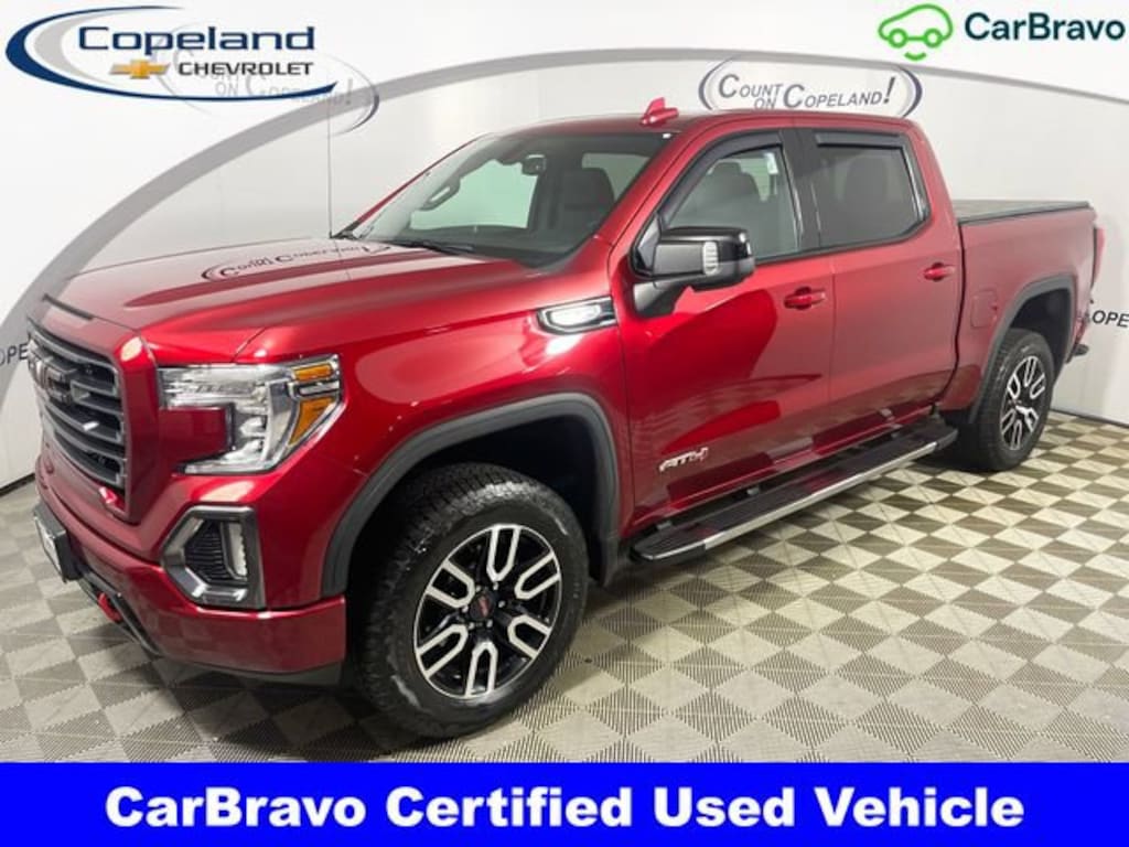 2 Keys, Sierra 1500 AT4, 4D Crew Cab, EcoTec3 6.2L V8, 4WD, 12-Volt Rear Auxiliary Power Outlet, 120-Volt Instrument Panel Power Outlet, 2 USB Ports, 2 USB Ports (1st Row), 4.2 Diagonal Color Display Driver Info Center, 4G LTE Wi-Fi Hotspot Capable, AT4 Preferred Package, Auto-Locking Rear Differential, Auxiliary External Transmission Oil Cooler, Body-Color Surround Grille, Color-Keyed Carpeting Floor Covering, Compass, Deep-Tinted Glass, Electric Rear-Window Defogger, Electrical Lock Control Steering Column, Floor-Mounted Center Console, Front Prem Floor Liners w/Removable Carpet Insert, GMC Connected Access Capable, HD Rear Vision Camera, Heated Driver & Front Outboard Passenger Seating, Heavy-Duty Air Filter, Hill Descent Control, Integrated Trailer Brake Controller, Keyless Open & Start, LED Cargo Area Lighting, Manual Tilt-Wheel & Telescoping Steering Column, Off-Road Suspension, OnStar & GMC Connected Services Capable, Power Door Locks, Power Front Passenger Windows w/Express Up/Down, Power Front Windows w/Driver Express Up/Down, Power Rear Windows w/Express Down, Power Sliding Rear Window w/Rear Defogger, Preferred Equipment Group 4SB, Premium Bose 7-Speaker Sound System, ProGrade Trailering System, Radio: Premium GMC Infotainment Sys w/Navigation, Rear Dual USB Charging-Only Ports, Rear Wheelhouse Liners, Red Recovery Hooks, Remote Vehicle Starter System, Speed-sensing steering, Spray-On Pickup Bed Liner w/AT4 Logo, Steering Wheel Audio Controls, Theft Deterrent System (Unauthorized Entry), Trailering Package, Universal Home Remote, Ventilated Driver & Front Passenger Seats, Wireless Charging. CARFAX One-Owner. Clean CARFAX.Certification Program Details:*Customer Benefits*CarBravo provides used vehicle shoppers and buyers with a comprehensive list of benefits, including: Omni-channel shopping and buying A vehicle history report Standard warranty coverages- CarBravo Certified Vehicles: 6 month/6,000 mile limited bumper to bumper warranty (whichever occurs first) Available extended coverages Roadside assistance and courtesy transportation (for duration of applicable vehicle warranty) Option of home delivery (in select areas where permitted) 10 day/500 mile exchange policy (whichever occurs first) OnStar and SiriusXM trials*Buyers of GM models:*- 1 month trial of OnStar and Connected Services- 1 month of Premium Plan coverage, inclusive of the OnStar Safety and Security Plan and the Connected Vehicle Plan- 3 month trial of SiriusXM*Buyers of non GM vehicles:*- 1 month trial of OnStar Guardian app: Available on select Apple and Android devices- 3 month trial of SiriusXM (if equipped with compatible radio)*Vehicle age must be less than or equal to 10 model years old and:*Vehicle must have less than 100,000 miles at time of saleCOUNT ON COPELAND for TOP QUALITY pre-owned vehicles.