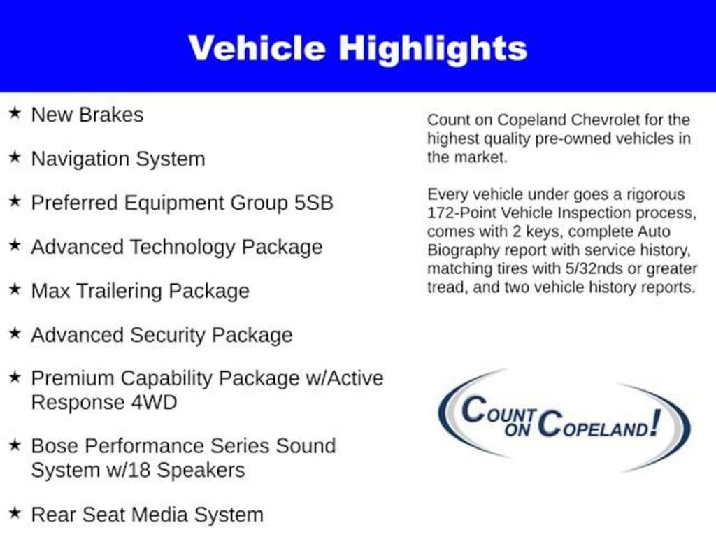 - Advanced Security Package, Advanced Technology Package, Max Trailering Package, Preferred Equipment Group 5SB, Premium Capability Package w/Active Response 4WD