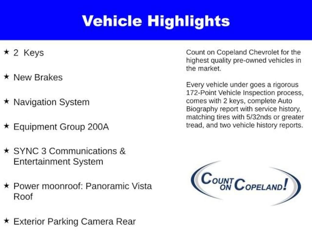 2 Keys, New Brakes, Nautilus Reserve, 4D Sport Utility, 2.0L Turbocharged, AWD, Equipment Group 200A, Exterior Parking Camera Rear, Navigation System, Power moonroof: Panoramic Vista Roof, SYNC 3 Communications & Entertainment System. Clean CARFAX.Certification Program Details:*Customer Benefits*CarBravo provides used vehicle shoppers and buyers with a comprehensive list of benefits, including: Omni-channel shopping and buying A vehicle history report Standard warranty coverages- CarBravo Certified Vehicles: 6 month/6,000 mile limited bumper to bumper warranty (whichever occurs first) Available extended coverages Roadside assistance and courtesy transportation (for duration of applicable vehicle warranty) Option of home delivery (in select areas where permitted) 10 day/500 mile exchange policy (whichever occurs first) OnStar and SiriusXM trials*Buyers of GM models:*- 1 month trial of OnStar and Connected Services- 1 month of Premium Plan coverage, inclusive of the OnStar Safety and Security Plan and the Connected Vehicle Plan- 3 month trial of SiriusXM*Buyers of non GM vehicles:*- 1 month trial of OnStar Guardian app: Available on select Apple and Android devices- 3 month trial of SiriusXM (if equipped with compatible radio)*Vehicle age must be less than or equal to 10 model years old and:*Vehicle must have less than 100,000 miles at time of saleCOUNT ON COPELAND for TOP QUALITY pre-owned vehicles.