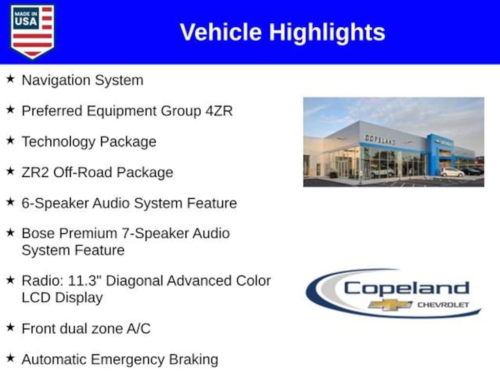 Count on Copeland Chevy for the best deal! - Available 2.9% for 72 Months on select models*! Colorado ZR2, 4D Crew Cab, 3.42 Rear Axle Ratio, 6-Speaker Audio System Feature, Adaptive Cruise Control, Apple CarPlay/Android Auto, Automatic Emergency Braking, Bose Premium 7-Speaker Audio System Feature, Chevy Safety Assist, Following Distance Indicator, Forward Collision Alert, Front dual zone A/C, Front Pedestrian & Bicyclist Braking, HD Surround Vision, Heated front seats, IntelliBeam Automatic High Beam On/Off, Lane Keep Assist w/Lane Departure Warning, Navigation System, Preferred Equipment Group 4ZR, Radio: 11.3 Diagonal Advanced Color LCD Display, Rear Pedestrian Alert, Steering Wheel Mounted Audio Controls, Technology Package, Ventilated front seats, Wireless Phone Projection, ZR2 Off-Road Package. Please read entire vehicle description for price detail or visit CopelandChevrolet.com.*Lease from payments are based on national Chevrolet lease examples on a specific trim level. See CopelandChevrolet.com for full lease disclosure. $1,500 - Exp. 10/31/2025 Price includes Count on Copeland Loyalty. Count on Copeland Loyalty - Current Copeland Chevy Customers who have previously purchased (leases excluded) a 2023 or newer Chevrolet new vehicle from Copeland Chevy will qualify for this loyalty offer and live in Brockton, Easton, Bridgewater, East Bridgewater, West Bridgewater, Mansfield, Norton, Randolph, Stoughton, or Avon. Cannot be combined with other offers and customers must finance with GM Financial. $500 - GM Card Sign Up & Spend Offer - New, pre-approved customers who apply for, get approved for, and spend a minimum of $1000 at the dealership at time of purchase/lease, can use this offer towards the purchase/lease of an eligible new Chevrolet. Exp. 10/31/2025