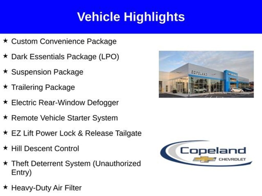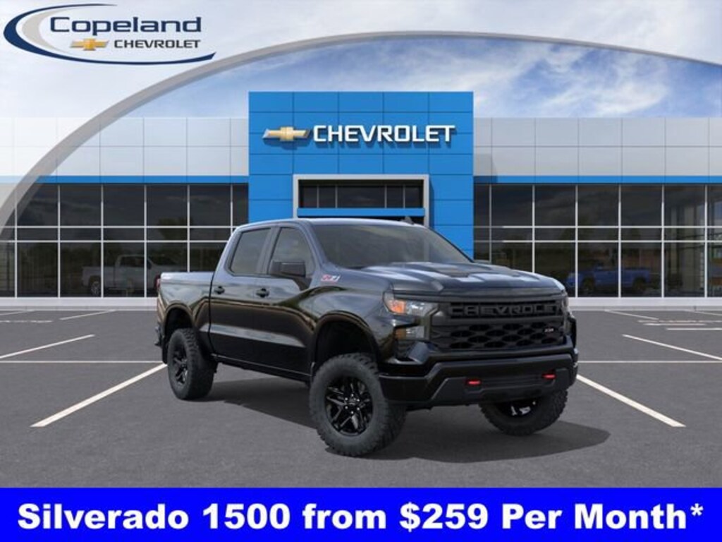 Count on Copeland Chevy for the best deal! - Available 0% APR on select new Chevrolet models*! Silverado 1500 Custom Trail Boss, 4D Crew Cab, EcoTec3 5.3L V8, Black Name Plates (LPO), Custom Convenience Package, Dark Essentials Package (LPO), Electric Rear-Window Defogger, EZ Lift Power Lock & Release Tailgate, Heavy-Duty Air Filter, Hill Descent Control, Hitch Guidance, LED Cargo Area Lighting, Mobile Service Plus (R9Y), Remote Vehicle Starter System, Suspension Package, Theft Deterrent System (Unauthorized Entry), Trailering Package. Please read entire vehicle description for price detail or visit CopelandChevrolet.com.*Lease from payments are based on national Chevrolet lease examples on a specific trim level. See CopelandChevrolet.com for full lease disclosure. ^All prices exclude tax, title, license, and doc fee. Price includes: $1250 - Trade Assistance. Exp. 02/02/2026 $1500 - Bonus Cash. Exp. 02/02/2026 $3250 - Customer Cash. Exp. 02/02/2026 $3,000 - Exp. 01/31/2026 Price includes Count on Copeland Loyalty. Count on Copeland Loyalty - Current Copeland Chevy Customers who have previously purchased (leases excluded) a new 2023 or newer Chevrolet Silverado from Copeland Chevy Brockton will qualify for this loyalty offer and live in Brockton, Easton, Bridgewater, East Bridgewater, West Bridgewater, Mansfield, Norton, Randolph, Stoughton, Raynham, or Avon. Cannot be combined with other offers and customers must finance with GM Financial. $500 - GM Card Sign Up & Spend Offer - New, pre-approved customers who apply for, get approved for, and spend a minimum of $1000 at the dealership at time of purchase/lease, can use this offer towards the purchase/lease of an eligible new Chevrolet. Exp. 01/31/2026