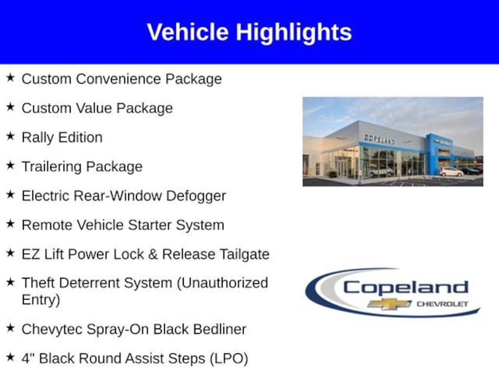 Count on Copeland Chevy for the best deal! - Available 0% APR on select new Chevrolet models*! Silverado 1500 Custom, 4D Crew Cab, 4WD, 4 Black Round Assist Steps (LPO), Black Chrome Exhaust Tip (LPO), Chevytec Spray-On Black Bedliner, Custom Convenience Package, Custom Value Package, Electric Rear-Window Defogger, EZ Lift Power Lock & Release Tailgate, Hitch Guidance, LED Cargo Area Lighting, Mobile Service Plus (R9Y), Rally Edition, Remote Vehicle Starter System, Theft Deterrent System (Unauthorized Entry), Trailering Package, Wheels: 20 x 9 High Gloss Black Painted Alum. Please read entire vehicle description for price detail or visit CopelandChevrolet.com.*Lease from payments are based on national Chevrolet lease examples on a specific trim level. See CopelandChevrolet.com for full lease disclosure. ^All prices exclude tax, title, license, and doc fee. Price includes: $1000 - Bonus Cash. Exp. 01/02/2026 $1250 - Trade Assistance. Exp. 01/02/2026 $2500 - Select Market Chevy Loyalty Cash. Exp. 01/02/2026 $3000 - Customer Cash. Exp. 01/02/2026 $3,000 - Exp. 12/31/2025 Price includes Count on Copeland Loyalty. Count on Copeland Loyalty - Current Copeland Chevy Customers who have previously purchased (leases excluded) a new 2023 or newer Chevrolet Silverado from Copeland Chevy Brockton will qualify for this loyalty offer and live in Brockton, Easton, Bridgewater, East Bridgewater, West Bridgewater, Mansfield, Norton, Randolph, Stoughton, Raynham, or Avon. Cannot be combined with other offers and customers must finance with GM Financial. $500 - GM Card Sign Up & Spend Offer - New, pre-approved customers who apply for, get approved for, and spend a minimum of $1000 at the dealership at time of purchase/lease, can use this offer towards the purchase/lease of an eligible new Chevrolet. Exp. 12/31/2025