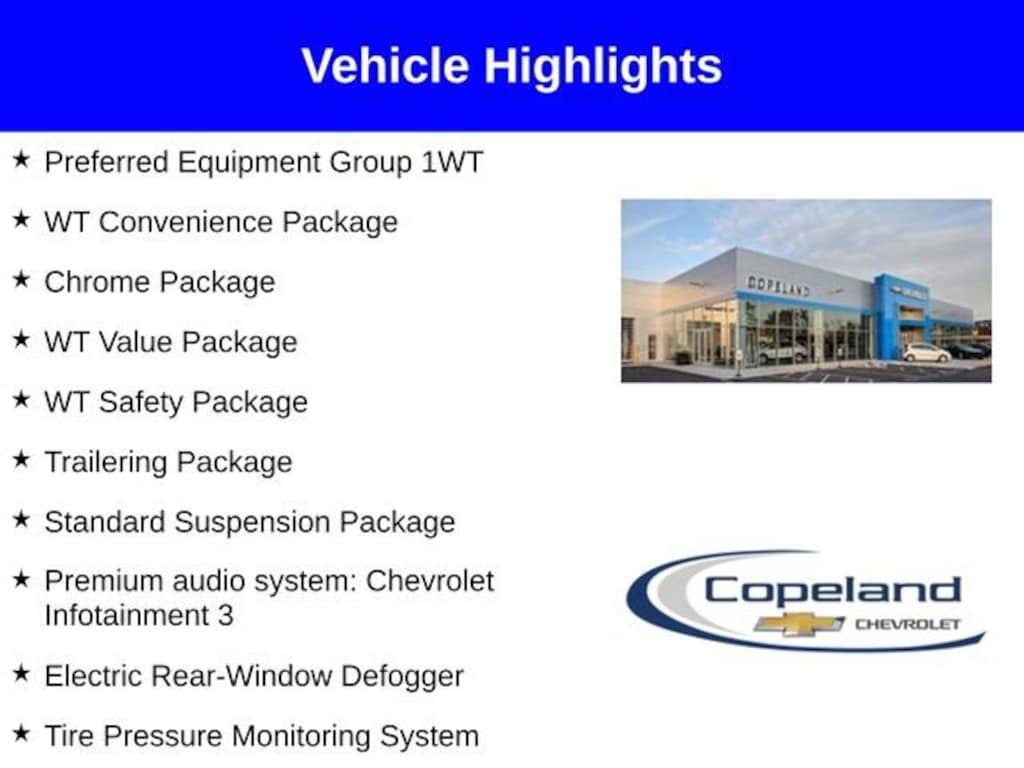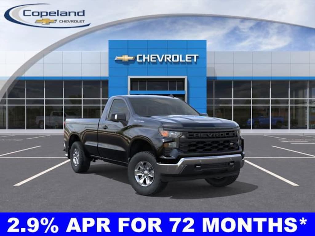 Count on Copeland Chevy for the best deal! - Available 2.9% for 72 Months on select models*! Silverado 1500 WT, 2D Standard Cab, EcoTec3 5.3L V8, 3.5 Monochromatic Display Driver Info Center, Apple CarPlay/Android Auto, Black (Semi-Gloss) Front Bumper, Black (Semi-Gloss) Rear Bumper, Chrome Package, Deep-Tinted Glass, Electric Rear-Window Defogger, Electronic Cruise Control, Following Distance Indicator, Forward Collision Alert, Front Chrome Bumper, Front Pedestrian Braking, Heated Power-Adjustable Outside Mirrors, High Gloss Black Mirror Caps, Hitch Guidance, Lane Change Alert w/Side Blind Zone Alert, Locking Tailgate, Perimeter Lighting, Polished Exhaust Tip, Preferred Equipment Group 1WT, Premium audio system: Chevrolet Infotainment 3, Rear Cross Traffic Braking, Rear Pedestrian Alert, Solar Absorbing Tinted Glass, Standard Suspension Package, Standard Tailgate, Tire Pressure Monitoring System, Trailering Package, Ultrasonic Front & Rear Park Assist, WT Convenience Package, WT Safety Package, WT Value Package. Please read entire vehicle description for price detail or visit CopelandChevrolet.com.*Lease from payments are based on national Chevrolet lease examples on a specific trim level. See CopelandChevrolet.com for full lease disclosure. ^All prices exclude tax, title, license, and doc fee. Price includes: $1000 - Bonus Cash. Exp. 11/03/2025 $1250 - Trade Assistance. Exp. 11/03/2025 $2000 - Customer Cash. Exp. 11/03/2025 $1,500 - Exp. 10/31/2025 Price includes Count on Copeland Loyalty. Count on Copeland Loyalty - Current Copeland Chevy Customers who have previously purchased (leases excluded) a 2023 or newer Chevrolet new vehicle from Copeland Chevy will qualify for this loyalty offer and live in Brockton, Easton, Bridgewater, East Bridgewater, West Bridgewater, Mansfield, Norton, Randolph, Stoughton, or Avon. Cannot be combined with other offers and customers must finance with GM Financial. $500 - GM Card Sign Up & Spend Offer - New, pre-approved customers who apply for, get approved for, and spend a minimum of $1000 at the dealership at time of purchase/lease, can use this offer towards the purchase/lease of an eligible new Chevrolet. Exp. 10/31/2025