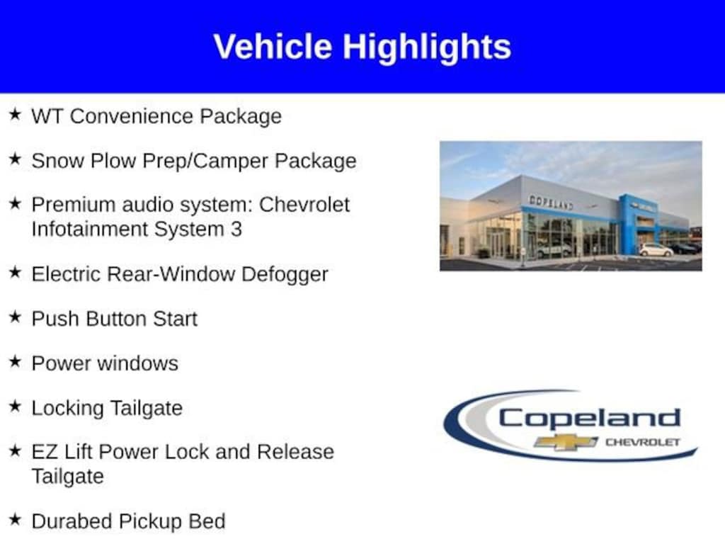 Count on Copeland Chevy for the best deal! - Available 0% APR on select new Chevrolet models*! Silverado 3500HD Work Truck, 6.6L V8, 4WD, Summit White, 220 Amp Alternator, Auto High-beam Headlights, Deep-Tinted Glass, Durabed Pickup Bed, Electric Rear-Window Defogger, EZ Lift Power Lock and Release Tailgate, Heavy-Duty 80 Amp-Hour Battery, Locking Tailgate, Mobile Service Plus - 1 Year, Multi-Flex Tailgate, Power windows, Premium audio system: Chevrolet Infotainment System 3, Push Button Start, Snow Plow Prep/Camper Package, Voltmeter, WT Convenience Package. Please read entire vehicle description for price detail or visit CopelandChevrolet.com.*Lease from payments are based on national Chevrolet lease examples on a specific trim level. See CopelandChevrolet.com for full lease disclosure. ^All prices exclude tax, title, license, and doc fee. Price includes: $1000 - Customer Cash. Exp. 02/02/2026 $3,000 - Exp. 01/31/2026 Price includes Count on Copeland Loyalty. Count on Copeland Loyalty - Current Copeland Chevy Customers who have previously purchased (leases excluded) a new 2023 or newer Chevrolet Silverado from Copeland Chevy Brockton will qualify for this loyalty offer and live in Brockton, Easton, Bridgewater, East Bridgewater, West Bridgewater, Mansfield, Norton, Randolph, Stoughton, Raynham, or Avon. Cannot be combined with other offers and customers must finance with GM Financial. $500 - GM Card Sign Up & Spend Offer - New, pre-approved customers who apply for, get approved for, and spend a minimum of $1000 at the dealership at time of purchase/lease, can use this offer towards the purchase/lease of an eligible new Chevrolet. Exp. 01/31/2026