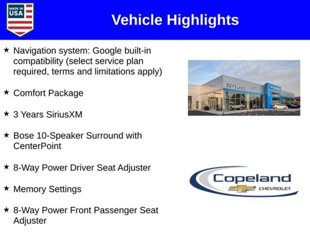 Count on Copeland Chevy for the best deal! - Available 0% APR on select new Chevrolet models*! Suburban Z71, 4D Sport Utility, EcoTec3 5.3L V8, 4WD, 2nd Row Power Release 60/40 Split-Folding Bench Seat, 3 Years SiriusXM, 3rd Row 60/40 Power-Folding Split-Bench, 8-Way Power Driver Seat Adjuster, 8-Way Power Front Passenger Seat Adjuster, Auto High-beam Headlights, Bose 10-Speaker Surround with CenterPoint, Comfort Package, Dual-Pane Power Panoramic Sunroof, Heated 2nd Row Outboard Seats, Heated Power-Adjustable Outside Mirrors, Heated Steering Wheel, LED Headlamps with LED Daytime Running Lamps, LED Tail Lamps, Memory Settings, Navigation system: Google built-in compatibility (select service plan required, terms and limitations apply), Rear Power Liftgate, Steering wheel mounted audio controls. Please read entire vehicle description for price detail or visit CopelandChevrolet.com.*Lease from payments are based on national Chevrolet lease examples on a specific trim level. See CopelandChevrolet.com for full lease disclosure. $2,028 - Exp. 12/31/2025 Price includes Count on Copeland Loyalty. Count on Copeland Loyalty - Current Copeland Chevy Customers who have previously purchased (leases excluded) a 2023 or newer Chevrolet new vehicle from Copeland Chevy Brockton will qualify for this loyalty offer and live in Brockton, Easton, Bridgewater, East Bridgewater, West Bridgewater, Mansfield, Norton, Randolph, Stoughton, Raynham, or Avon. Cannot be combined with other offers and customers must finance with GM Financial. $500 - GM Card Sign Up & Spend Offer - New, pre-approved customers who apply for, get approved for, and spend a minimum of $1000 at the dealership at time of purchase/lease, can use this offer towards the purchase/lease of an eligible new Chevrolet. Exp. 12/31/2025