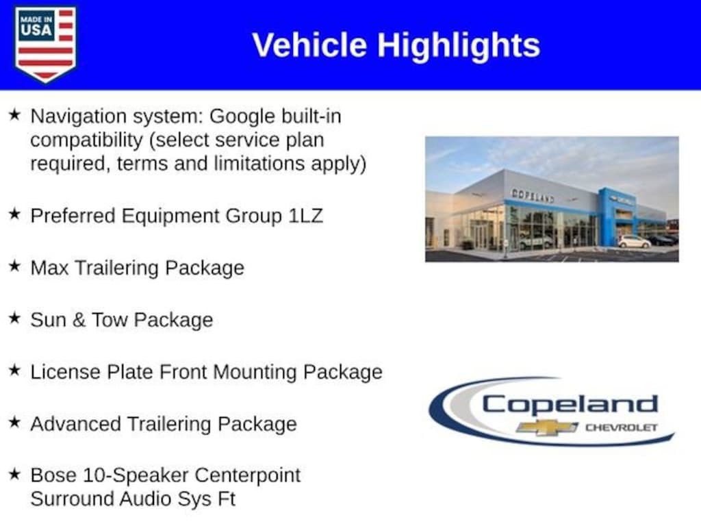 Count on Copeland Chevy for the best deal! - Available 2.9% for 72 Months on select models*! Tahoe Premier, EcoTec3 5.3L V8, 4WD, 1st & 2nd Row Color-Keyed Carpeted Floor Mats, 2-Speed Active Electronic AutoTrac Transfer Case, 3-Spoke Wrapped Steering Wheel, 3rd Row 60/40 Power-Folding Split-Bench Seat, Advanced Trailering Package, Apple CarPlay/Android Auto, Blind Zone Steering Assist w/Trailering, Bose 10-Speaker Centerpoint Surround Audio Sys Ft, Chrome Door Handles w/Body-Color Strip, Driver & Front Passenger Heated & Ventilated Seats, Dual Exhaust System, Dual-Pane Power Panoramic Sunroof, Front dual zone A/C, Front LED Fog Lamps, Frontal Driver & Outboard Passenger Airbags, Heated 2nd Row Outboard Seats, Heated Steering Wheel, Hill Descent Control, Hitch View w/Pan/Zoom Image Adjustment, Integrated Trailer Brake Controller, Interior Camera, Key Card, LED Headlamps w/LED Daytime Running Lamps, LED Tail Lamps, License Plate Front Mounting Package, Max Trailering Package, Memory Settings, Navigation system: Google built-in compatibility (select service plan required, terms and limitations apply), Outside Heated Power-Adjustable Mirrors, Power Release 2nd Row Bucket Seats, Power Tilt & Telescopic Steering Column, Preferred Equipment Group 1LZ, Premium audio system: Chevrolet Infotainment 3 Premium, Rear Power Liftgate, Remote Start, Smart Trailer Integration Indicator, Sun & Tow Package, Universal Home Remote, Wireless Phone Charging. Please read entire vehicle description for price detail or visit CopelandChevrolet.com.*Lease from payments are based on national Chevrolet lease examples on a specific trim level. See CopelandChevrolet.com for full lease disclosure. $2,132 - Exp. 10/31/2025 Price includes Count on Copeland Loyalty. Count on Copeland Loyalty - Current Copeland Chevy Customers who have previously purchased (leases excluded) a 2023 or newer Chevrolet new vehicle from Copeland Chevy will qualify for this loyalty offer and live in Brockton, Easton, Bridgewater, East Bridgewater, West Bridgewater, Mansfield, Norton, Randolph, Stoughton, or Avon. Cannot be combined with other offers and customers must finance with GM Financial. $500 - GM Card Sign Up & Spend Offer - New, pre-approved customers who apply for, get approved for, and spend a minimum of $1000 at the dealership at time of purchase/lease, can use this offer towards the purchase/lease of an eligible new Chevrolet. Exp. 10/31/2025