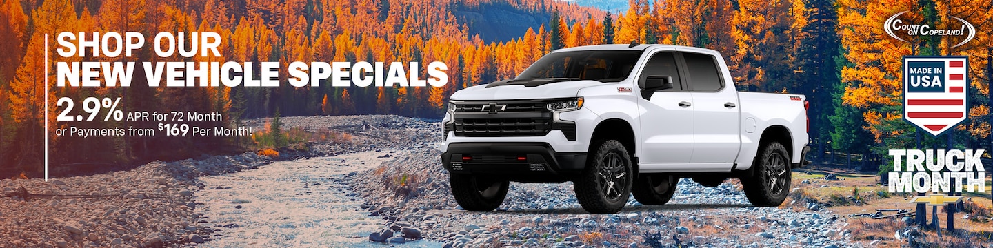 Are you looking for your next vehicle? Want to save money on your dream car, truck, or SUV? Then, visit Copeland Chevrolet to check out our inventory of new vehicles. Once you find your ideal vehicle, be sure to check out available financing and leasing special offers.