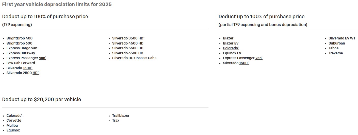 For 100 years, Chevy has helped business owners do what it takes to get the job done. Both large and small businesses may be eligible to immediately deduct up to 100% of the purchase price* of qualifying Chevy vehicles.